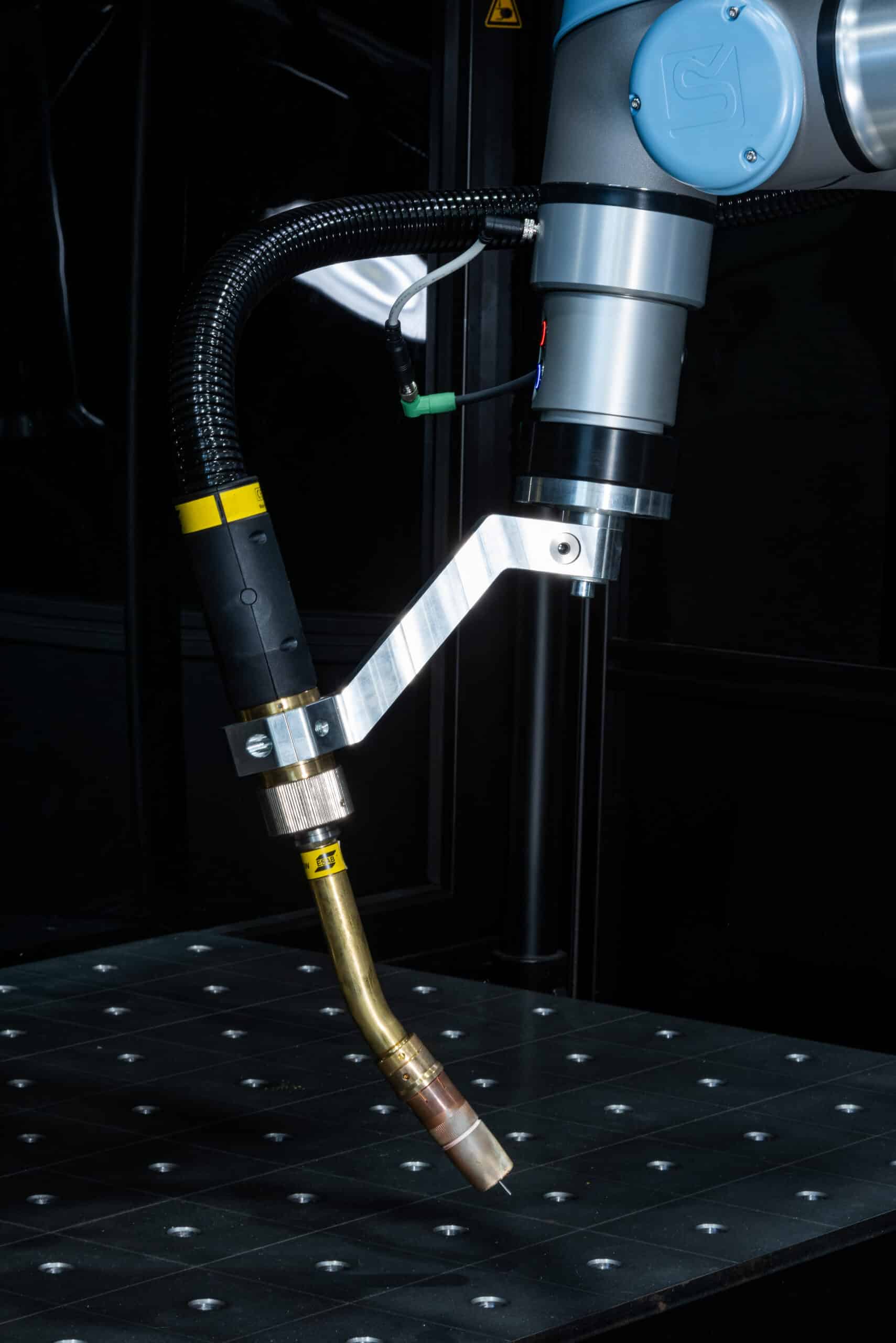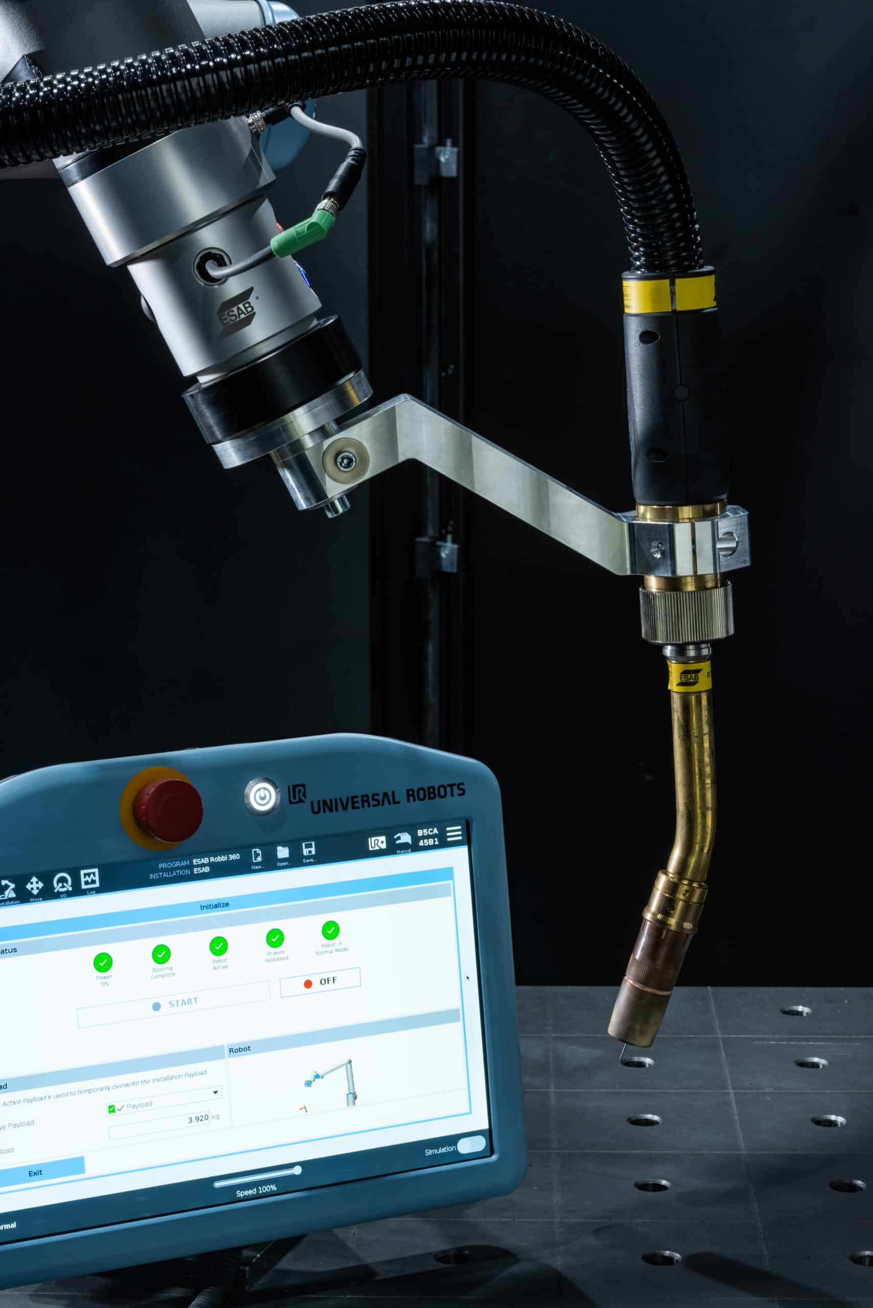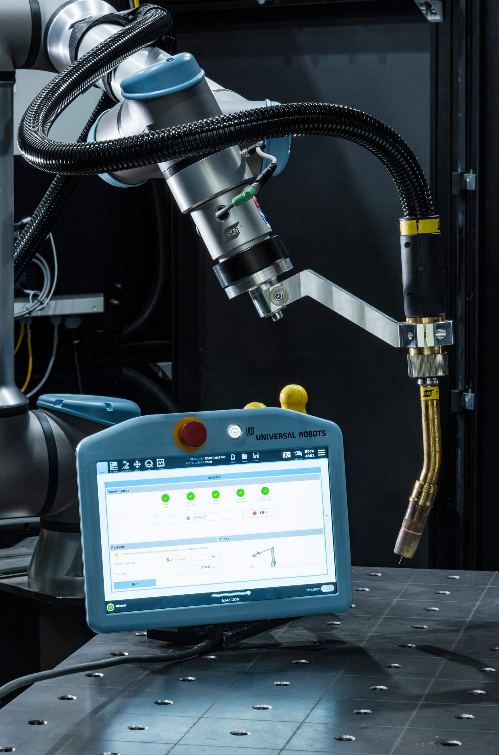 Designed for fast deployment and intuitive operation, ROBBI enables welders to automate repetitive tasks without requiring advanced robotic programming expertise. The system features collaborative robots from Universal Robots (UR10e or UR20e), paired with ESAB’s Aristo® Edge 500R power source and RoboFeed Edge robotic wire feeder.